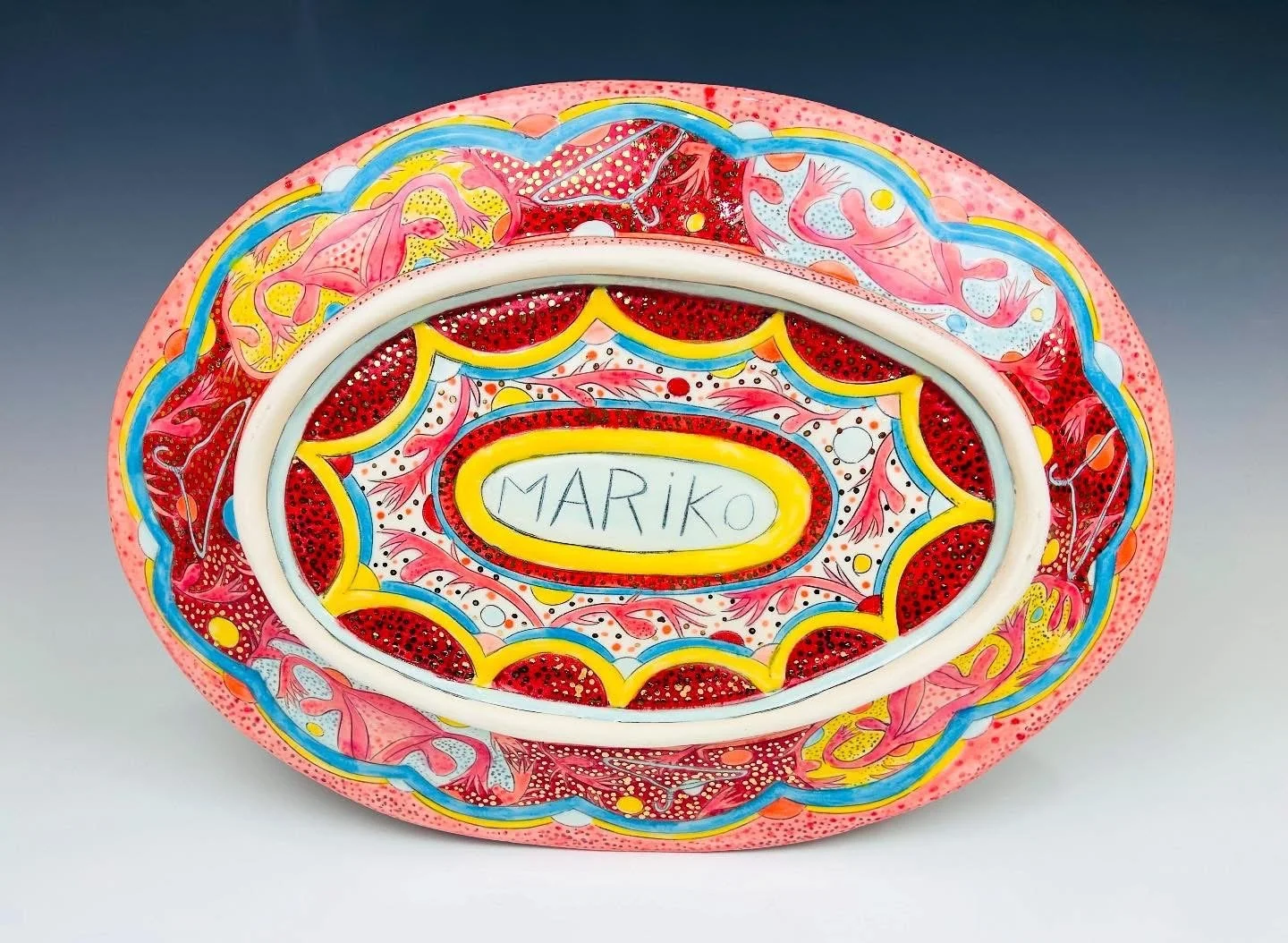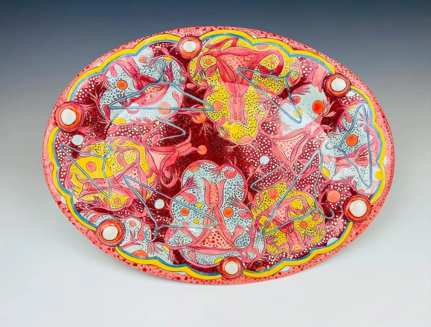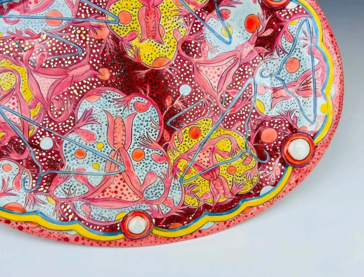 A combination of underglazes, glazes, china paints, decals and gold lustre make for a cacophony of visual pleasure.